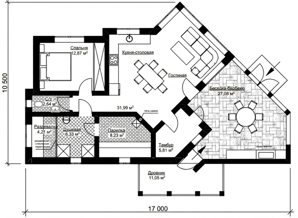 Проект одноэтажного дома 10,5 на 17 метров, площадью 148 м2, из кирпича, с парилкой и беседкой-барбекю